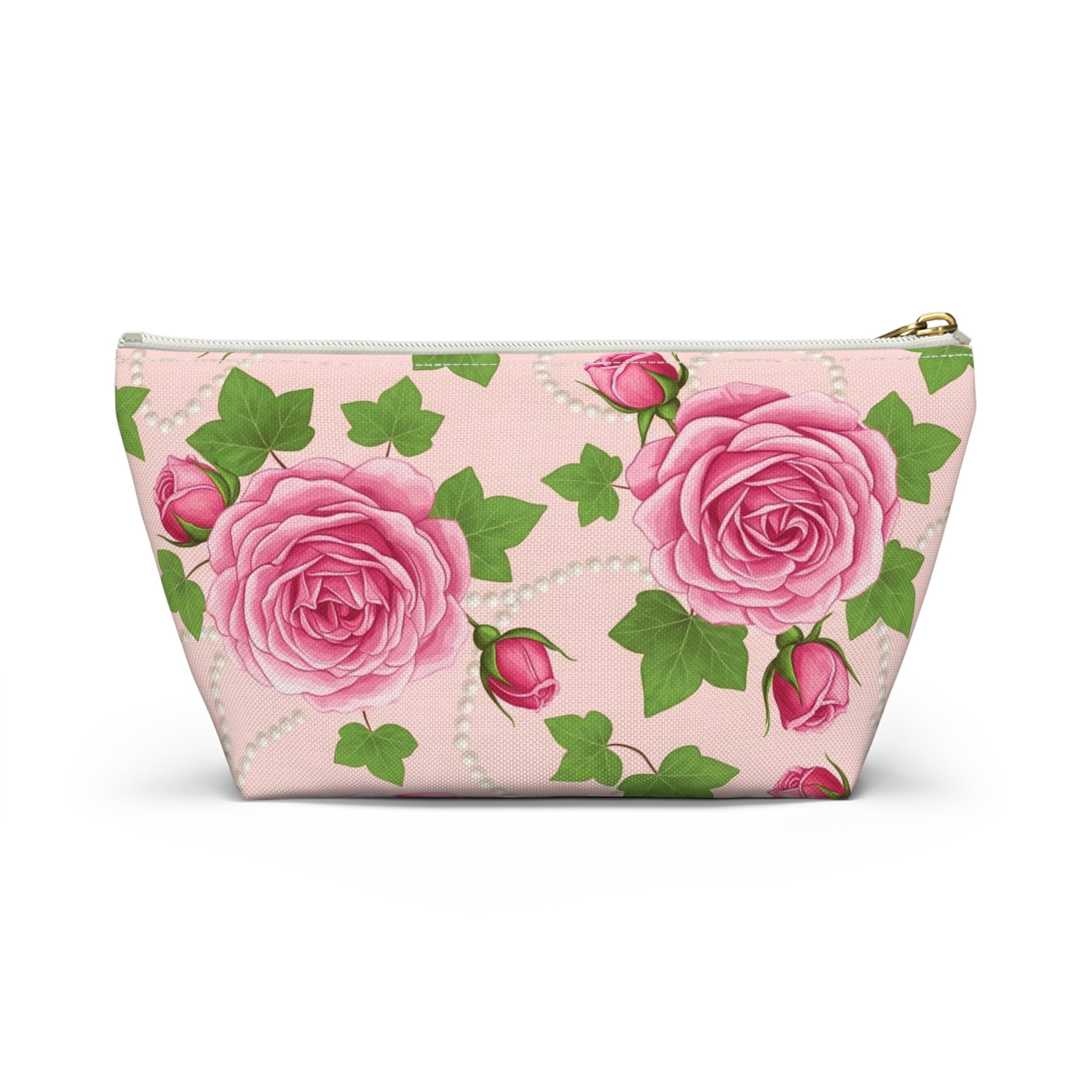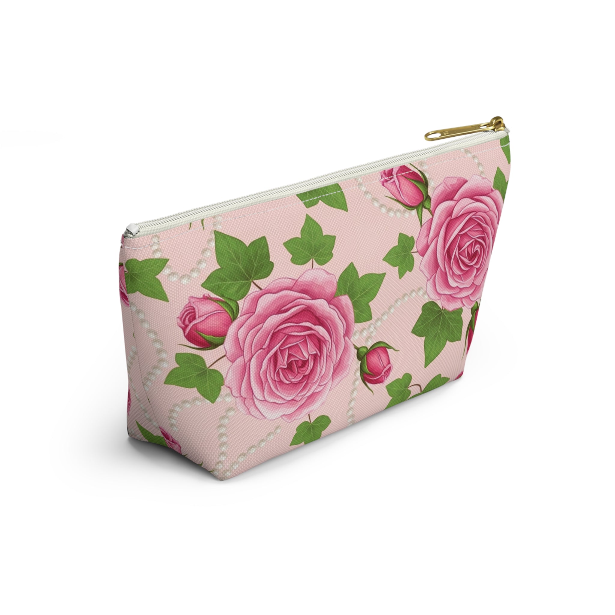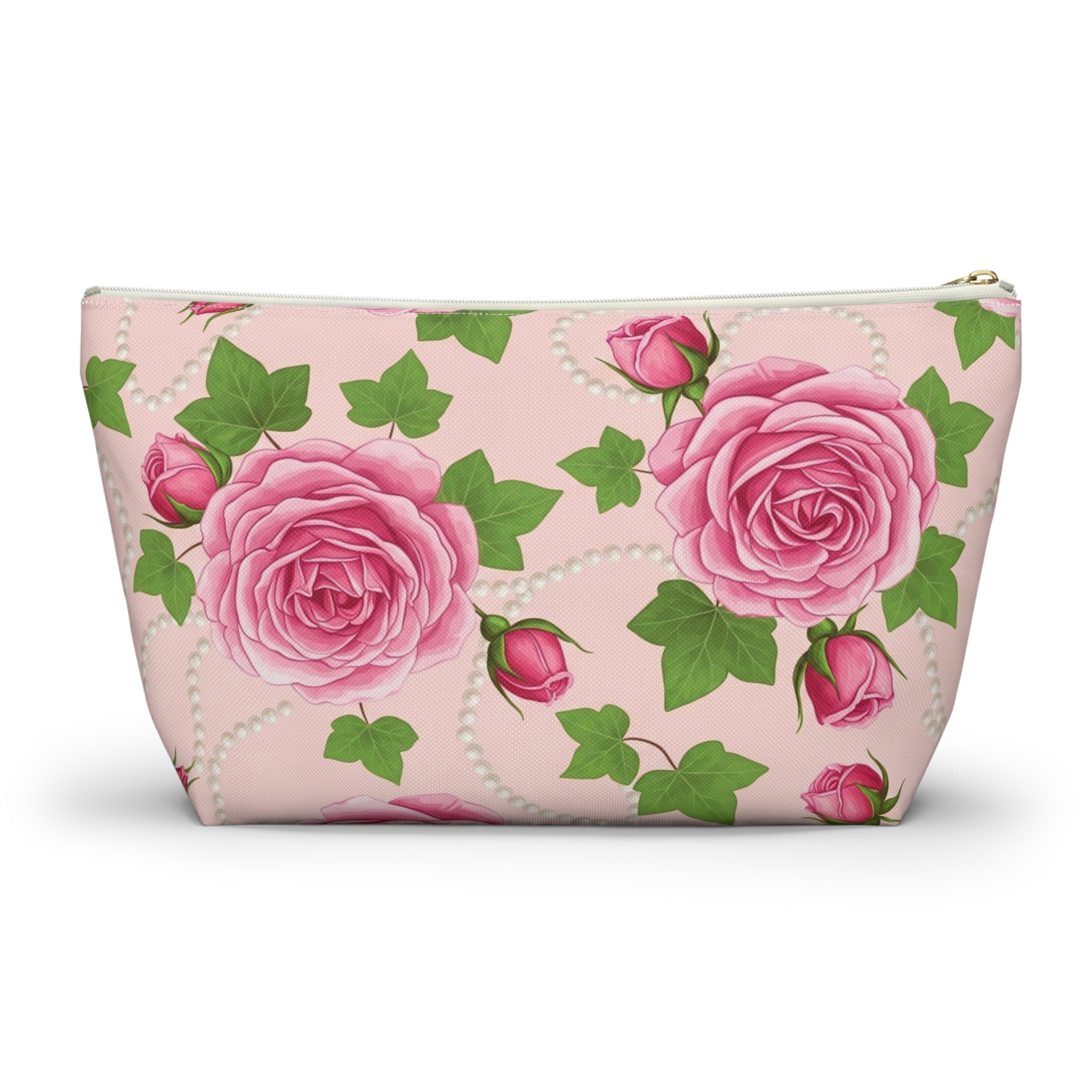 Add a soft touch of vintage romance to your everyday routine with this Pink Ivy & Pearls Accessory Pouch. Featuring blush pink roses, trailing ivy leaves, and delicate pearl strands, this inspired floral cosmetic bag blends timeless elegance with practical organization.